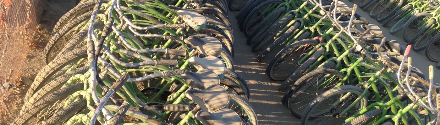 There is however a fleet of 1,000 bikes available for use through the Community Yellow Bike Program at Burning Man. These bikes are single speed Huffy “Cranbrook” models {Mens & Womens} that are actually painted green. There are 1,000 adult bikes for public use but there are no children’s bikes available.